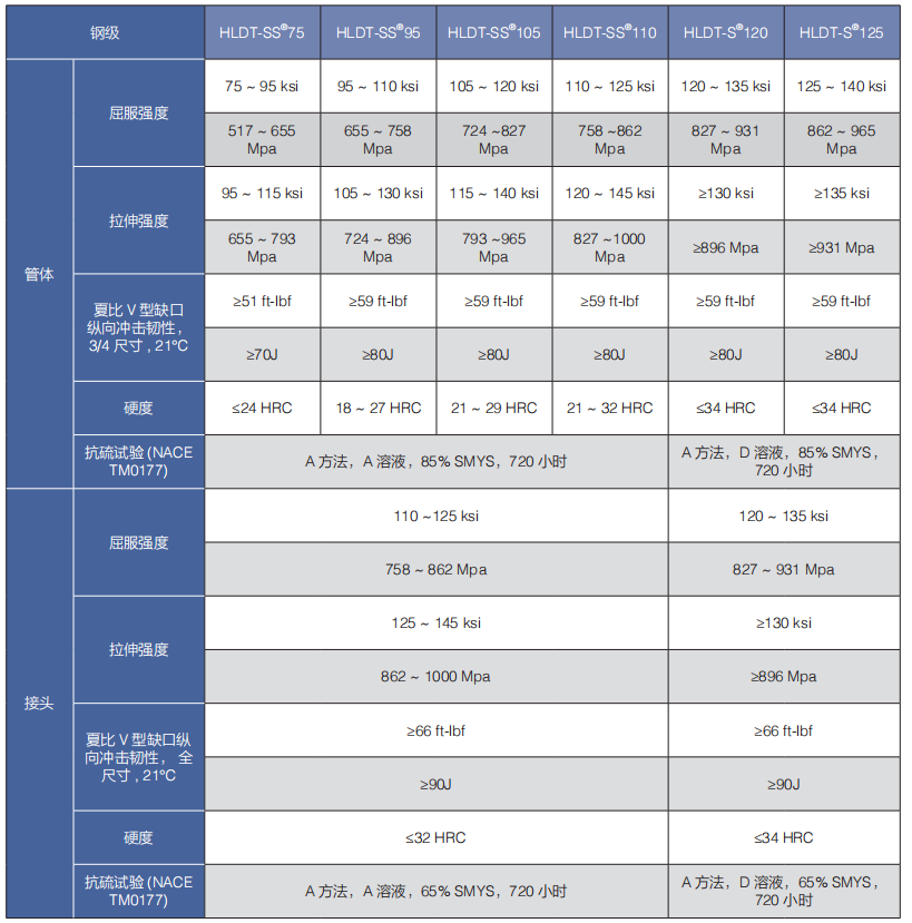 (b)海隆抗硫鉆桿鋼級(jí):HLDT-SS®75、HLDT-SS®95、HLDT-SS®105、HLDT-SS®110、HLDT-S®120、HLDT-S®125。